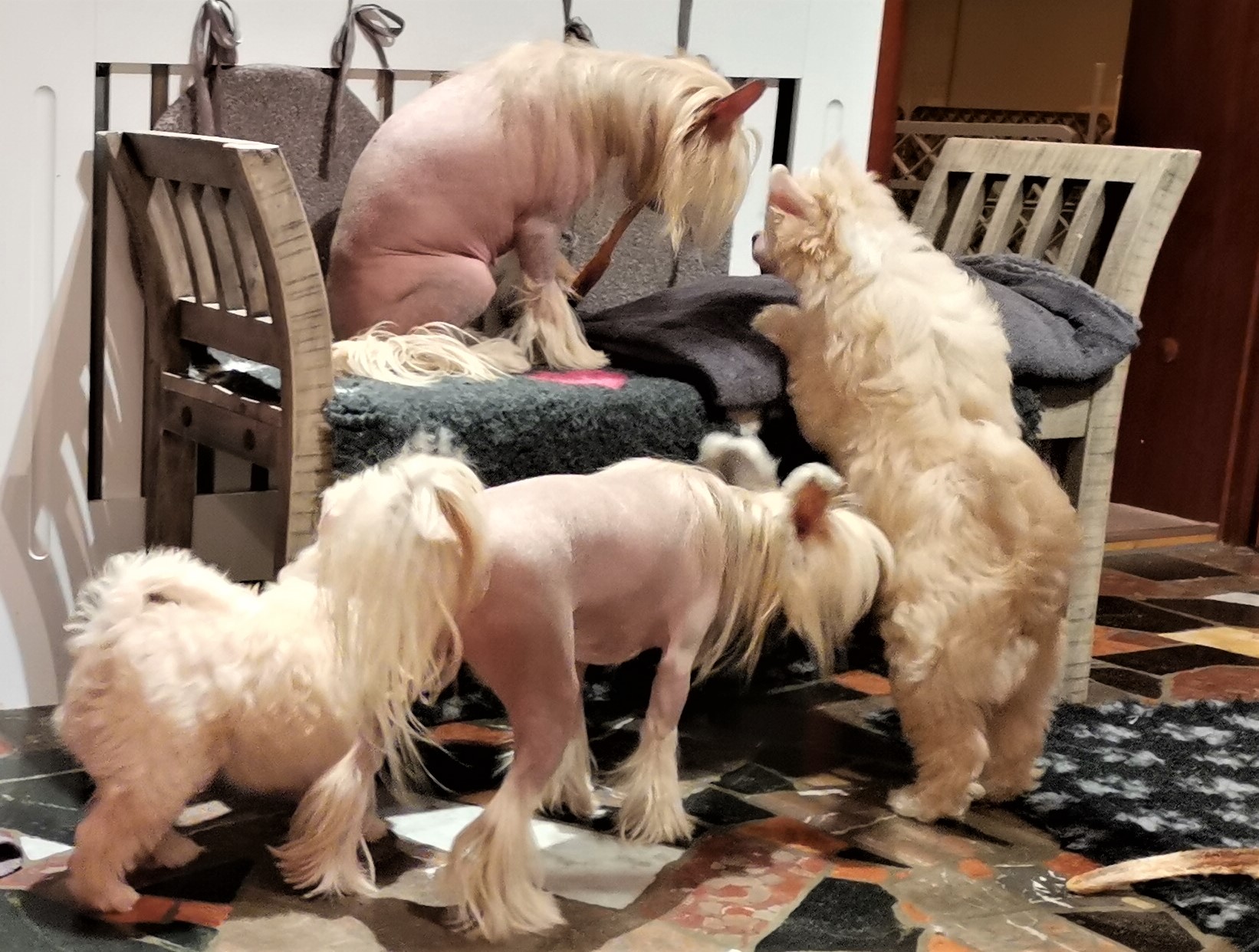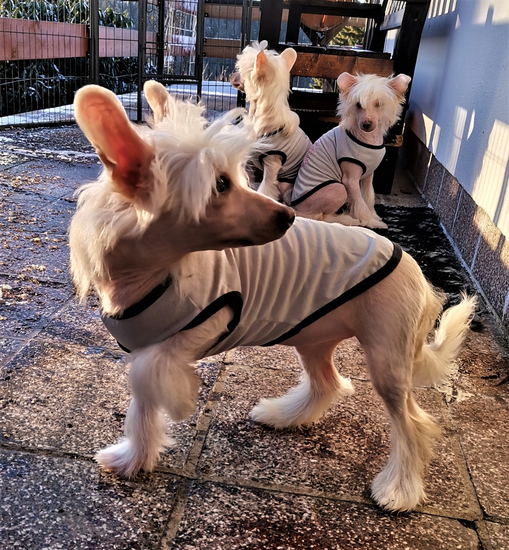 Nun erleben wir im Bergschlösschen den ersten Winter. Naja, die Powderpuffs sind schön warm eingekuschelt, aber die Hairless-Kinder wollen schnell wieder in die warme Stube. Da müssen wir mal die warmen Jacken anziehen.